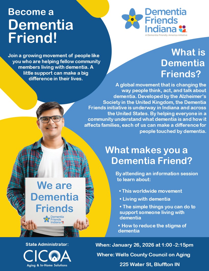 The Wells County Council on Aging serves all Wells County residents, especially senior citizens age 60+ and persons with disabilities. The Wells County Council on Aging is a private 501(c)(3) not-for-profit corporation. Our office hours are Monday through Friday 8:30am to 4:30pm.