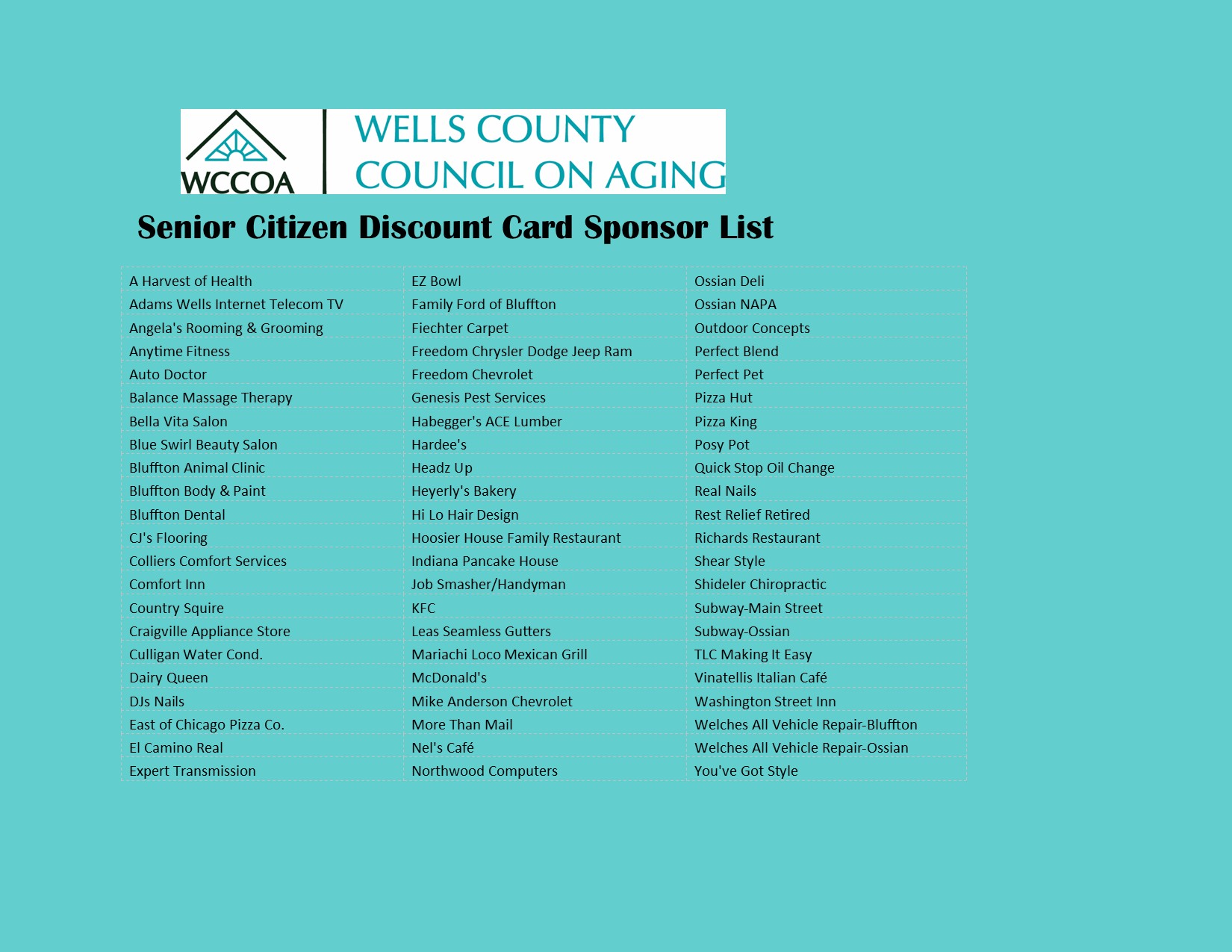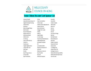 Many local businesses offer a discount to seniors age 55+. Restaurants, beauty shops, retail sales, auto services, etc. provide valuable specific discounts with presentation of our senior citizen discount card. These cards are good for the duration of the current year and are non-transferable. They may be purchased in our reception area for $10. The card can be laminated for an additional dollar. We now accept credit/debit cards!